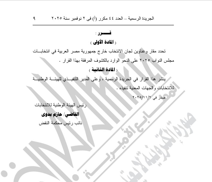 ونصت المادة الأولى على تُحدد مقار وعناوين لجان الانتخاب خارج جمهورية مصر العربية في انتخابات مجلس النواب ٢٠٢٥ على النحو الوارد بالكشوف المرفقة بالقرار.