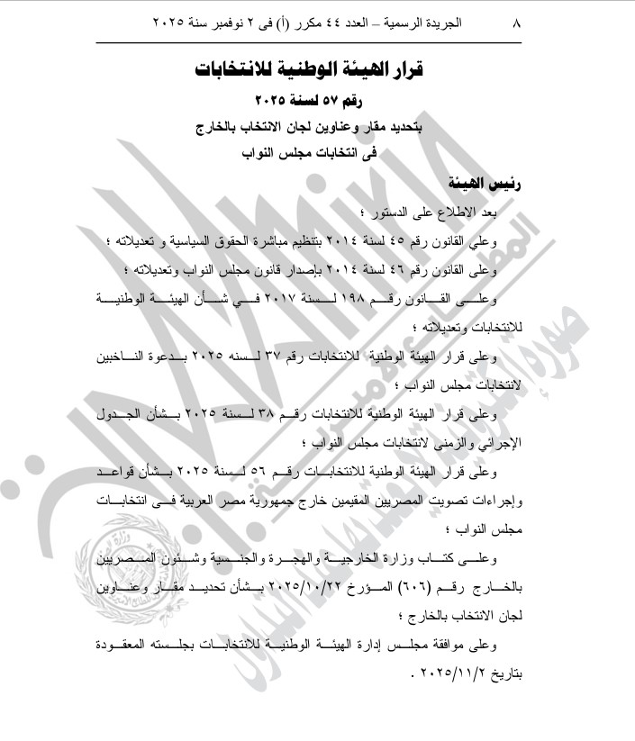 ونص القرار رقم ٥٧ على تحديد مقار وعناوين لجان الانتخاب خارج جمهورية مصر العربية في انتخابات مجلس النواب لعام ٢٠٢٥، وذلك بناءً على أحكام الدستور والقوانين المنظمة لمباشرة الحقوق السياسية وقانون مجلس النواب، القانون رقم ١٩٨ لسنة ٢٠١٧ بشأن الهيئة الوطنية للانتخابات وتعديلاته، قرارات الهيئة الوطنية للانتخابات أرقام ٣٧ و٣٨ و٥٦ لسنة ٢٠٢٥ الخاصة بدعوة الناخبين ووضع الجدول الزمني وقواعد تصويت المصريين بالخارج، والكتاب الوارد من وزارة الخارجية والهجرة والجنسية وشئون المصريين بالخارج رقم (٦٠٦) المؤرخ في ٢٢ أكتوبر ٢٠٢٥ بشأن تحديد مقار وعناوين لجان الانتخاب بالخارج.