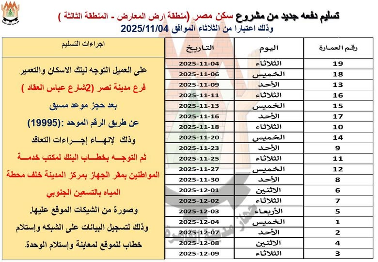 أعلن جهاز تنمية مدينة القاهرة الجديدة بدء تسليم دفعة جديدة من وحدات مشروع “سكن مصر” بمنطقة أرض المعارض – المنطقة الثالثة، وذلك اعتبارًا من اليوم الثلاثاء الموافق 2025/11/04.