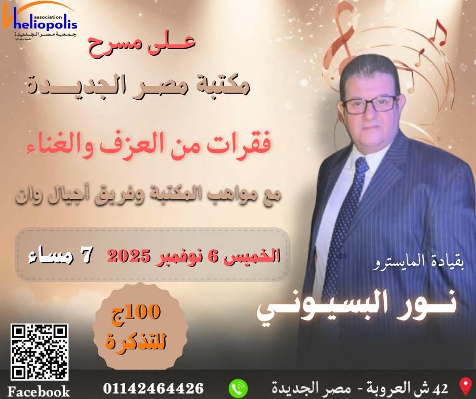 تنظم مكتبة مصر الجديدة العامة فى الساعة السابعة من مساء بعد غد الخميس، حفل موسيقى لمواهب المكتبة نتاج ورش لتعليم كافة أنواع الآلات الموسيقية وعزف كورال وطبلة وغناء بقيادة الفنان نور البسيوني.