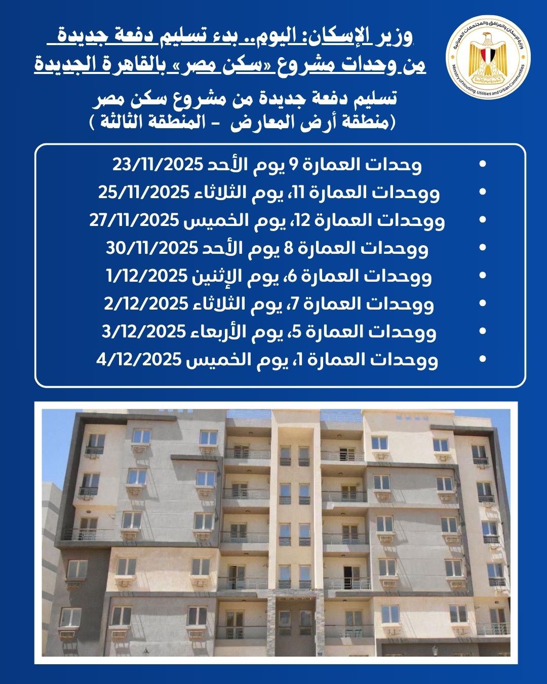 وأوضح المهندس أحمد رشاد، رئيس جهاز تنمية مدينة القاهرة الجديدة، أنه سيتم تسليم دفعة جديدة من مشروع سكن مصر (منطقة أرض المعارض - المنطقة الثالثة )، حيث سيتم تسليم وحدات العمارة 19، يوم الثلاثاء 4/11/2025، ووحدات العمارة رقم 18، يوم الخميس 6/11/2025، ووحدات العمارة 13، يوم الأحد 9/11/2025، ووحدات العمارة 16، يوم الثلاثاء 11/11/2025، ووحدات العمارة 15، يوم الخميس 13/11/2025، ووحدات العمارة 17 يوم الأحد 16/11/2025، ووحدات العمارة 10، يوم الثلاثاء 18/11/2025، ووحدات العمارة 14، يوم الخميس 20/11/2025.