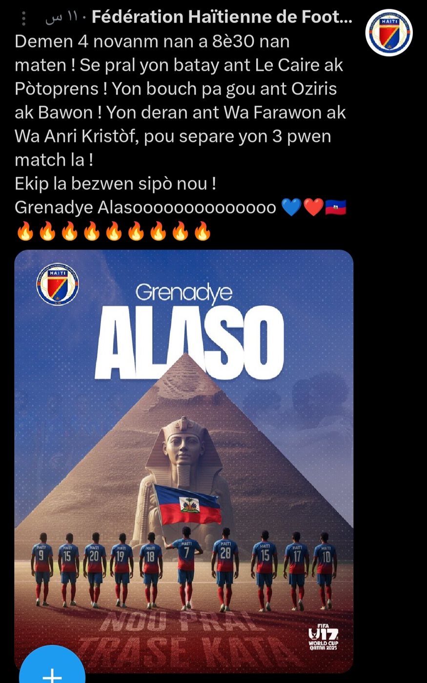 وعلقت صفحة الاتحاد الهايتي على المواجهة المرتقبة بين منتخب بلادهم ومصر بكأس العالم اليوم بنشر صورة لمنتخب هايتي أمام الأهرامات، معلقين: “مواجهة بين الفراعنة وهنري كريستوف”.