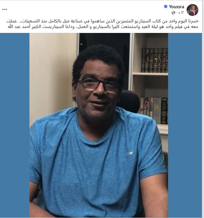 نعت الفنانة يسرا، السيناريست الكبير أحمد عبد الله، الذي وافته المنية بعد مسيرة فنية مؤثرة، أثرى خلالها السينما المصرية بالكثير من الأعمال البارزة.