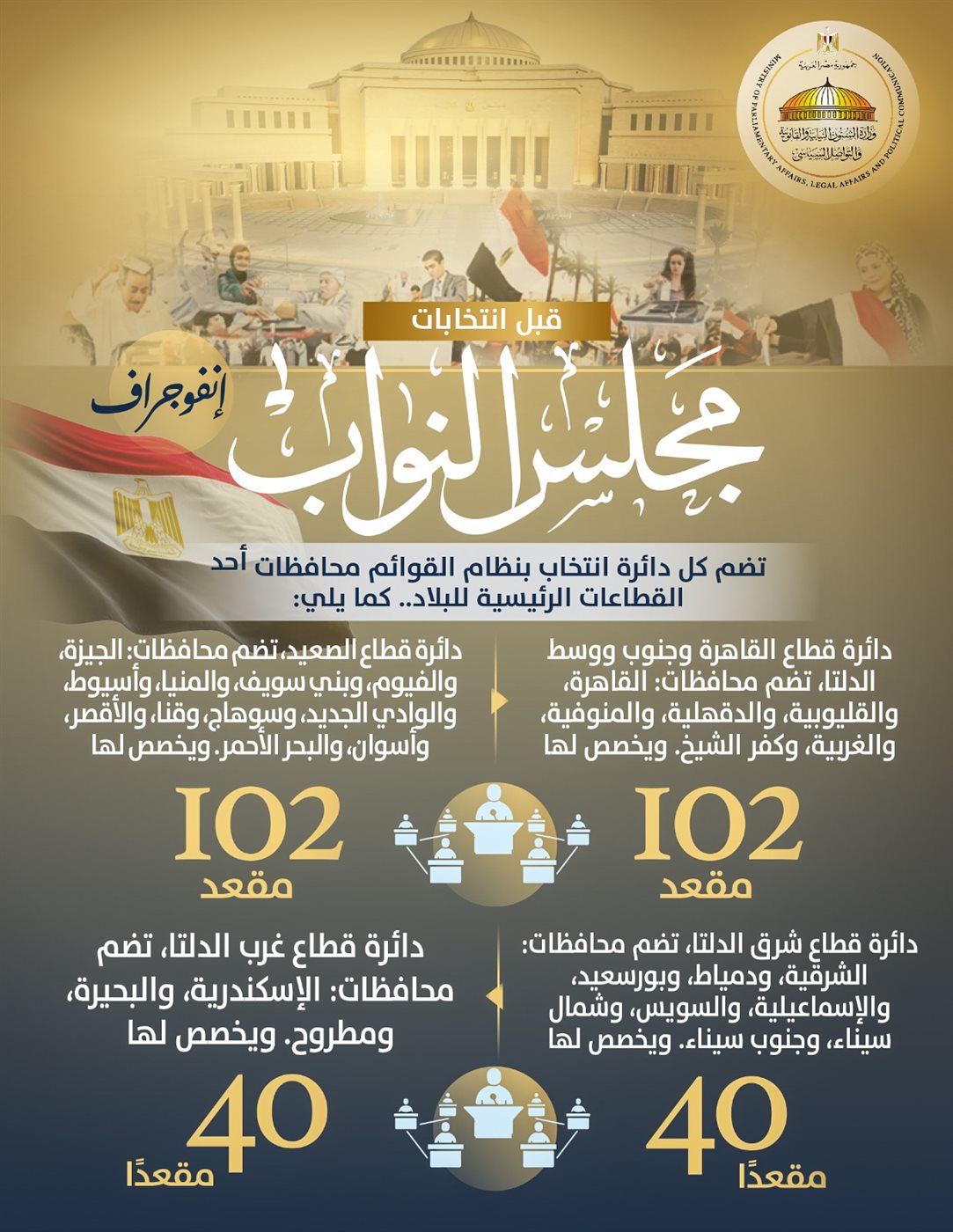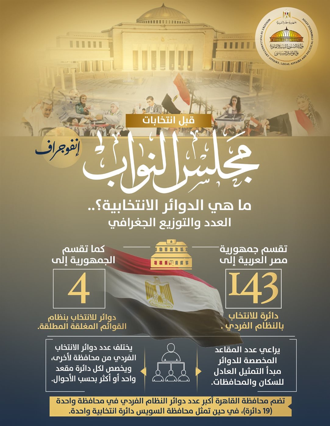 كما تنشر وزارة الشئون النيابية، إنفوجرافًا ثان، يتعلق بكل المعلومات عن الدوائر الانتخابية، فيما يخص العدد والتوزيع الجغرافي.