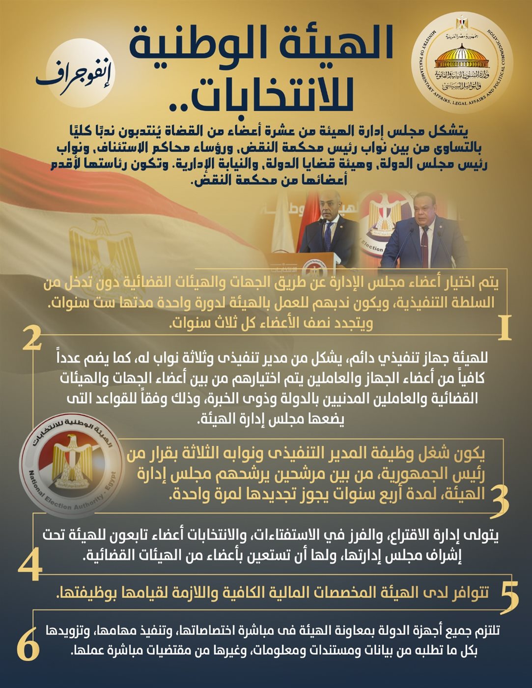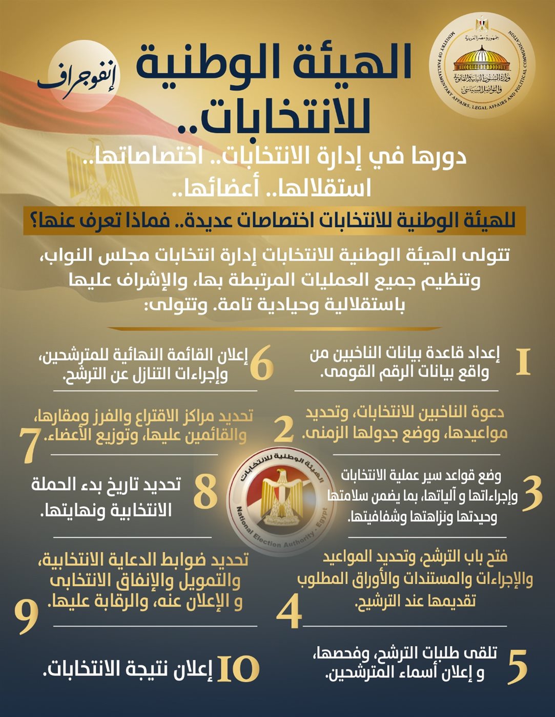 الشئون النيابية تنشر إنفوجراف لتعريف المواطنين بمهام الهيئة الوطنية للانتخابات