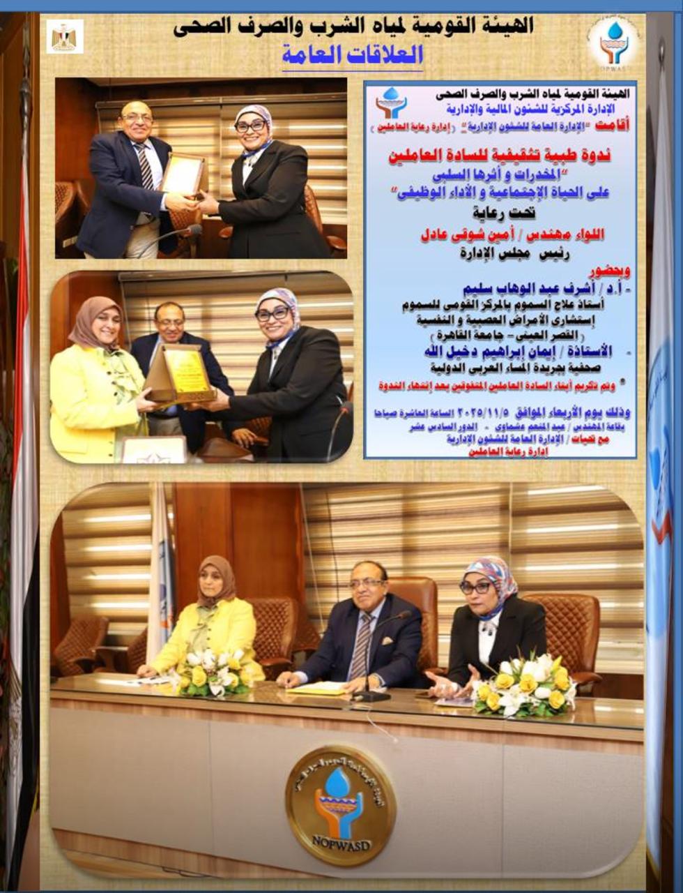 نظّم قطاع خدمة المجتمع وتنمية البيئة بكلية طب قصر العيني برئاسة الدكتور عمر عزام، بالتعاون مع المركز القومي للسموم الإكلينيكية والبيئية الذي تديره الدكتورة عائشة محمد سمير، ندوة توعوية للعاملين بالهيئة القومية لمياه الشرب والصرف الصحي بعنوان “المخدرات وأثرها السلبي على الحياة الاجتماعية والأداء الوظيفي”.