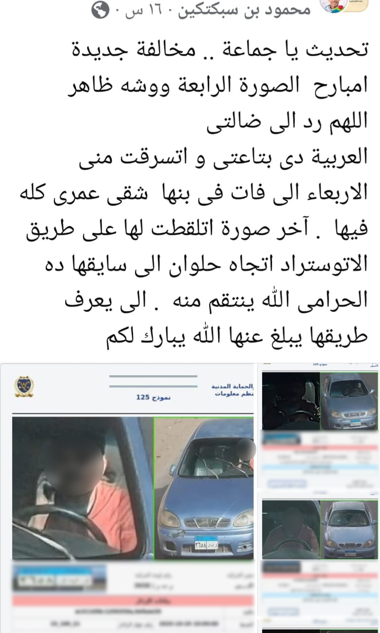 صرخة "محمود" على الإنترنت: "تحديث يا جماعة، مخالفة جديدة إمبارح، الصورة الرابعة ووشه ظاهر! اللهم ردّ إليّ ضالتي. العربية دي بتاعتي واتسرقت مني الأربعاء... آخر صورة التقطت له على طريق الأوتوستراد اتجاه حلوان. اللي يعرف طريقها يبلغ عنها."