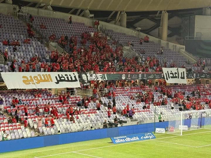 ورفعت جماهير الأهلي المتواجدة في ملعب المباراة لافتة تحمل رسالة: “لا أعذار.. ننتظر التتويج”.