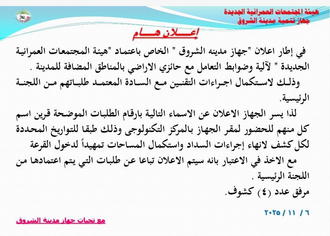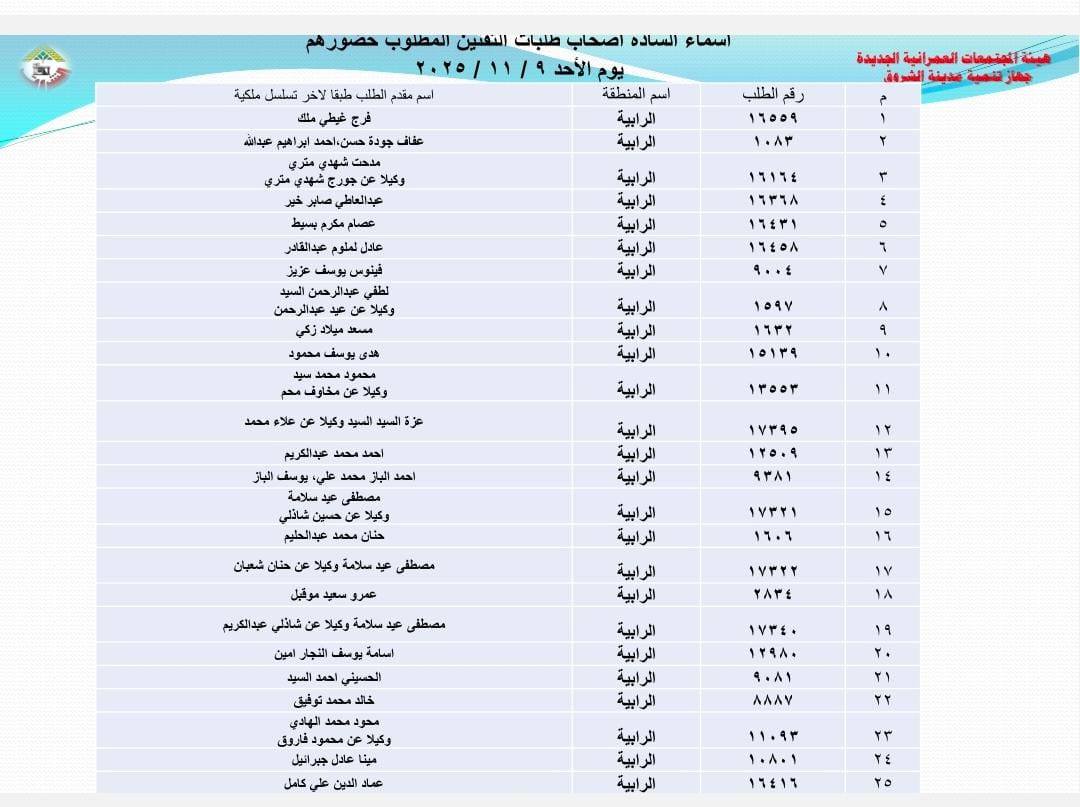 الإعلان عن أسماء دفعة جديدة لأصحاب طلبات تقنين الأراضي بتوسعات الشروق