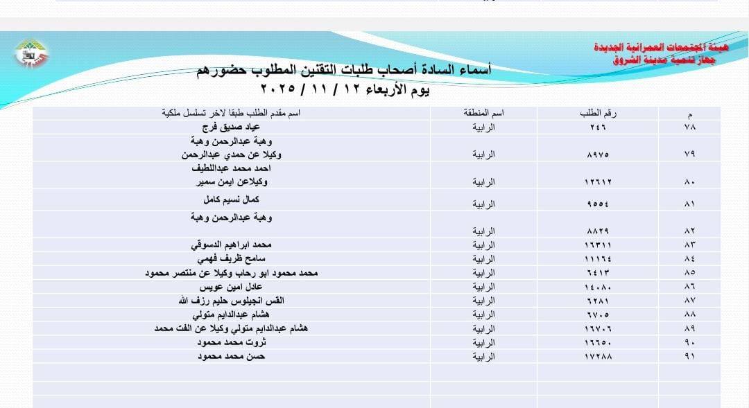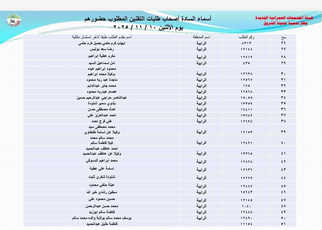 أعلنت هيئة المجتمعات العمرانية بوزارة الإسكان، عن أسماء دفعة جديدة من أصحاب طلبات تقنين أراضيهم بتوسعات مدينة الشروق، وطالبتهم بالحضور إلى مقر جهاز المدينة لاستكمال إجراءات التقنين، وذلك بداية من يوم الأحد المقبل 9 نوفمبر.
