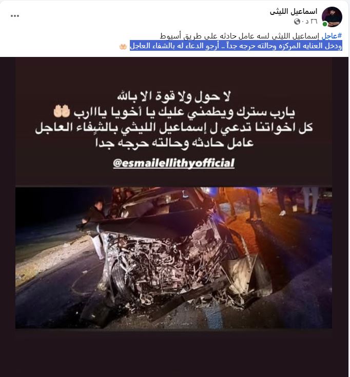 وقال مصدر مقرب من الفنان إسماعيل الليثي، إن الحادث وقع نتيجة اصطدام سيارة أخرى بسيارته بشكل مباشر أثناء سيره بالطريق، مضيفًا: "كان راجع من شغله في أسيوط، العربية اللي قصادهم دخلت في عربيته وش في وش، وتم نقله على المستشفى فورًا، ونتمنى من الله أن يعديها على خير".