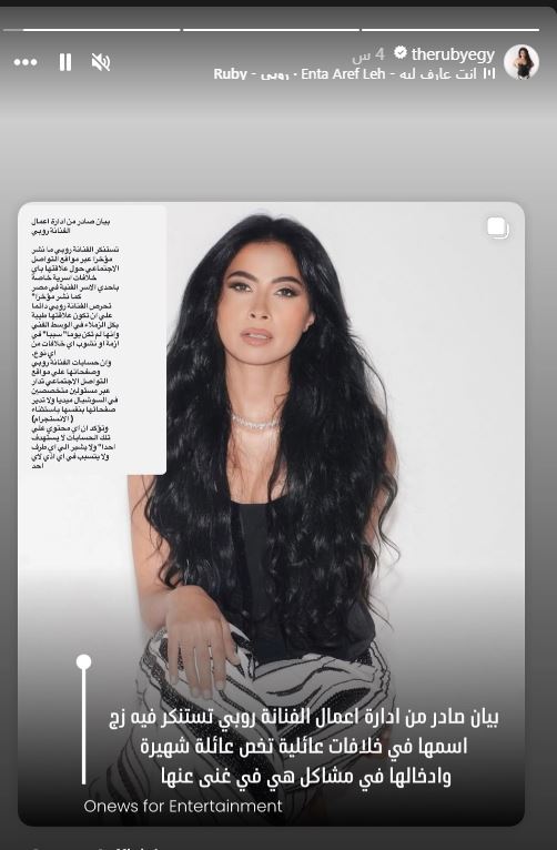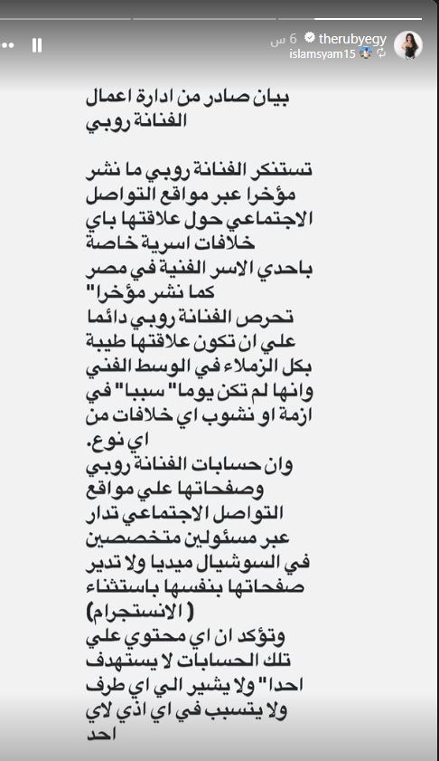 الأمر الذي دعا روبي إلى نشر بيان عبر حسابها الرسمي على "إنستجرام" قالت فيه: "تستنكر الفنانة روبي ما نشر مؤخرًا عبر مواقع التواصل الاجتماعي حول علاقتها بأي خلافات أسرية خاصة بإحدى الأسر الفنية في مصر كما نشر مؤخرًا".