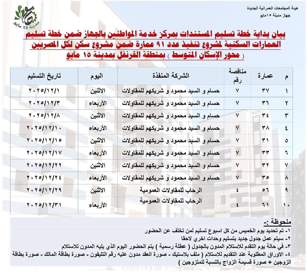بدء تسليم شقق سكن لكل المصريين للإسكان المتوسط بمدينة 15 مايو