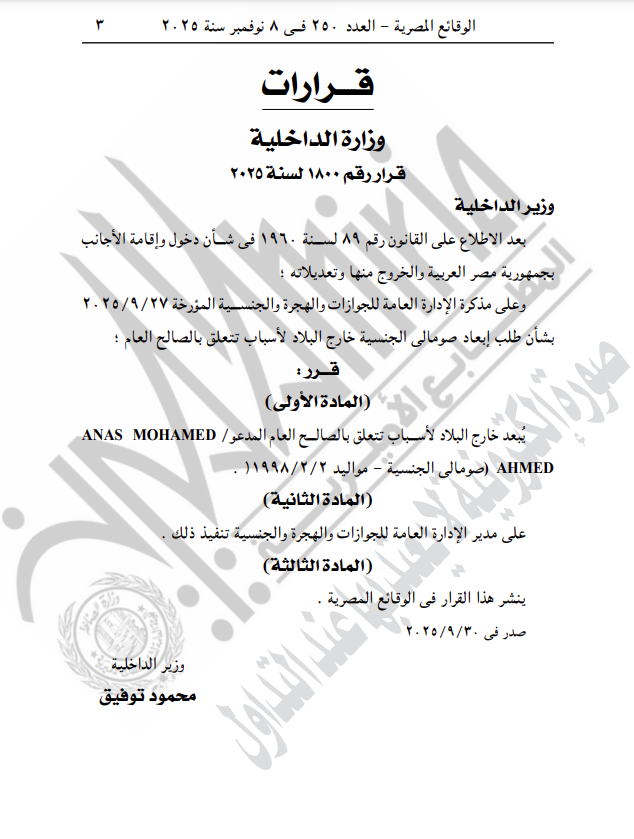 -قرار وزارة الداخلية رقم 1800 لسنة 2025، بشأن إبعاد أنس محمد أحمد، صومالي الجنسية مواليد 1998، خارج البلاد لأسباب تتعلق بالصالح العام.
