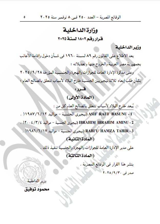 -قرار وزارة الداخلية رقم 1802 لسنة 2025، بشأن إبعاد 3 مواطنين نيجيريين (أسيف روف بسانيو مواليد 1987، وإبراهيم إبراهيم أمينو مواليد 2004، ورابيو حمزة طاهر مواليد 1986)، خارج البلاد لأسباب تتعلق بالصالح العام.