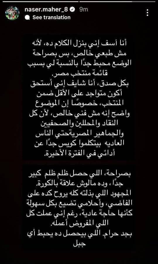 وقال ناصر ماهر إنه لم يعتد نشر مثل هذه الرسائل، لكن الوضع كان محبطًا للغاية بالنسبة له، مضيفًا أنه يرى نفسه يستحق التواجد على الأقل ضمن القائمة، خاصة في ظل إشادة المحللين والجماهير والإعلام بأدائه منذ انضمامه للزمالك.