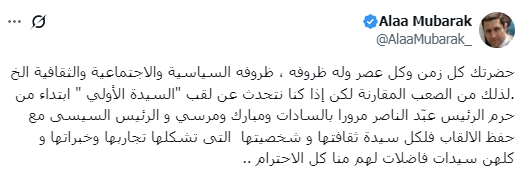 ورد علاء مبارك على امتداح أحد المتابعين لوالدته سوزان مبارك ودورها في المجالات الثقافية والاجتماعية، فقال: "كل زمن وكل عصر وله ظروفه، ظروفه السياسية والاجتماعية والثقافية الخ.. لذلك من الصعب المقارنة، لكن إذا كنا نتحدث عن لقب "السيدة الأولى " ابتداء من حرم الرئيس عبّد الناصر مرورًا بالسادات ومبارك ومرسي والرئيس السيسى مع حفظ الألقاب فلكل سيدة ثقافتها وشخصيتها التى تشكلها تجاربها وخبراتها وكلهن سيدات فاضلات لهم منا كل الاحترام.."