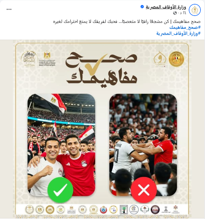 ونشرت الصفحة الرسمية للأوقاف عبر موقع التواصل الاجتماعي “ فيس بوك” صورة للمشجعين وعلقت عليها:" صحح مفاهيمك | كن مشجعًا راقيًا لا متعصبًا… فحبك لفريقك لا يمنع احترامك لغيره"، وذلك ضمن مباردة صحح مفاهيمك.