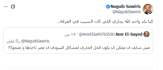 أزمة السودان، علق رجل الأعمال نجيب ساويرس على أحد متابعيه، الذي قدم مقترحًا وصفه بأنه جذري لعلاج المشكلات التي تواجه السودان حاليًا، يدور حول عودة السودان لمصر مرة أخرى، كما كانت قبل انفصال السودان عن مصر.