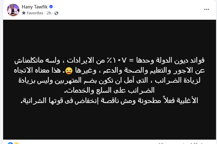 وقال الخبير الاقتصادي هاني توفيق عن زيادة فوائد ديون الدولة: "فوائد ديون الدولة وحدها = ١٠٧٪ من الإيرادات، ولسة متكلمناش عن الأجور والتعليم والصحة والدعم، وغيرها..".