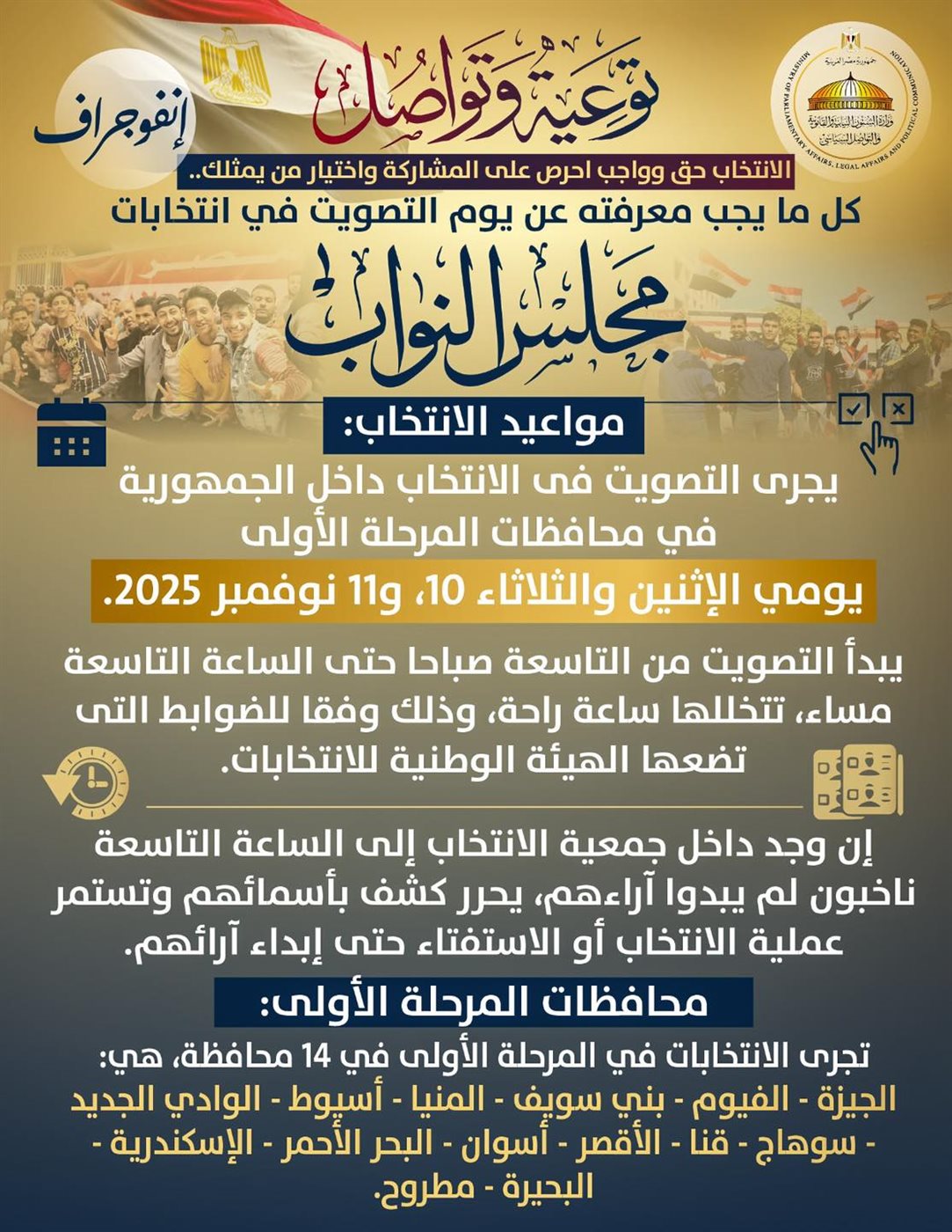 واصلت وزارة الشئون النيابية والقانونية والتواصل السياسي، نشر عدد من التعليمات الخاصة بانتخابات مجلس النواب 2025، تحت عنوان "توعية وتواصل.. الانتخاب حق وواجب احرص على المشاركة واختيار من يمثلك".