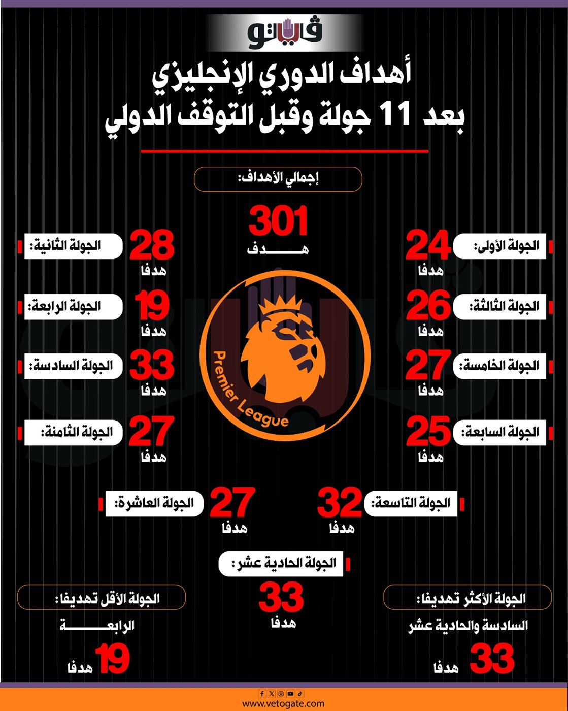 أهداف الدوري الإنجليزي بعد 11 جولة وقبل التوقف الدولي (إنفوجراف)