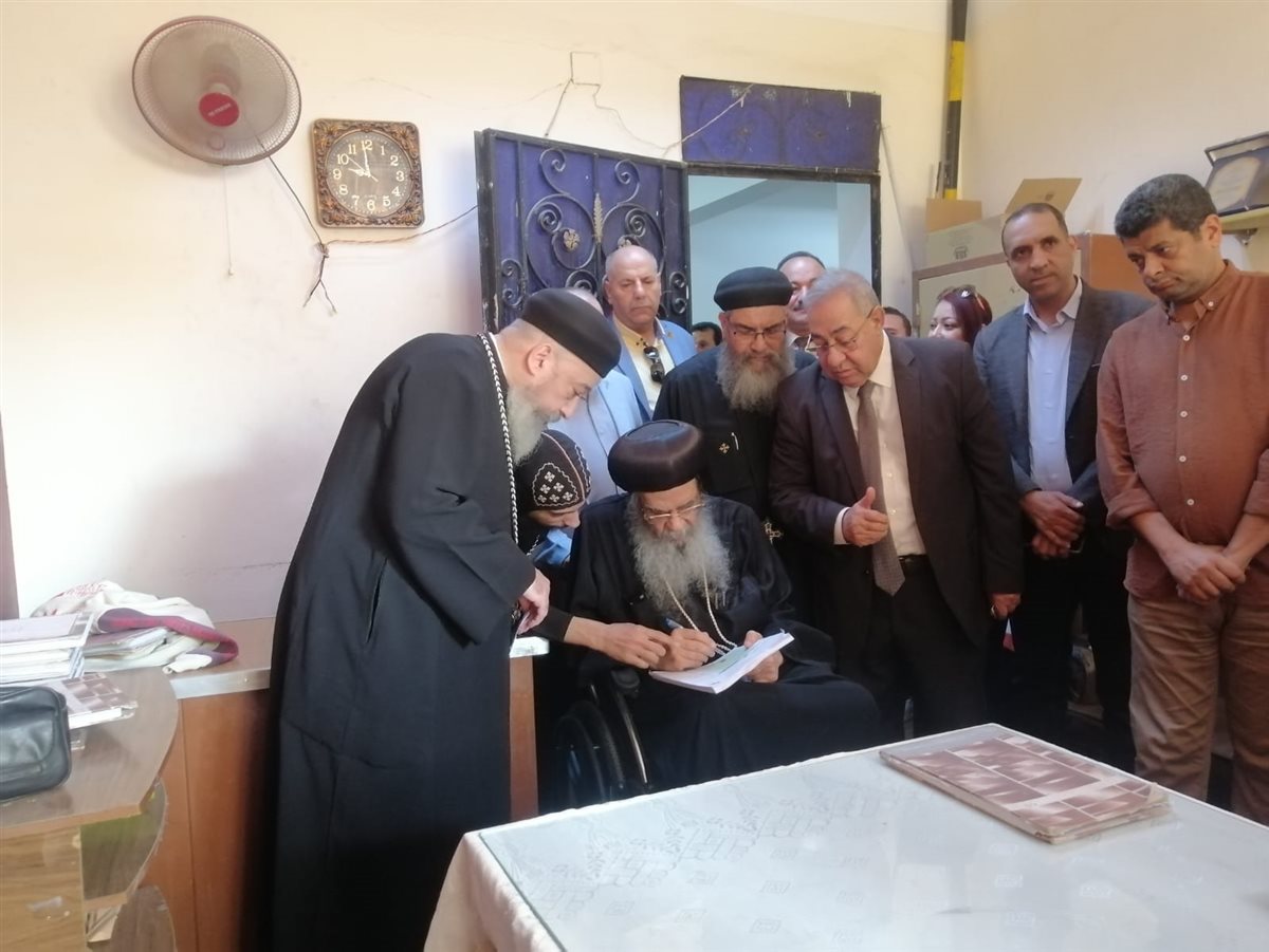 على كرسي متحرك، مطران الفيوم يدلي بصوته في انتخابات مجلس النواب (صور)