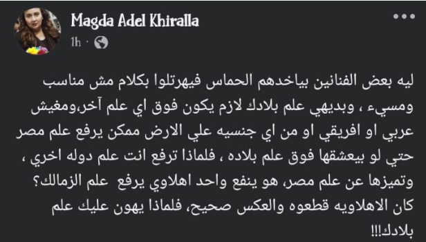 وأضافت ماجدة خير الله في رسالتها التي وجهتها لأحمد سعد: "فلماذا ترفع أنت علم دولة أخرى وتميزه عن علم مصر؟ هل ينفع واحد أهلاوي يرفع علم الزمالك؟ كان الأهلاوية قطعوه، والعكس صحيح، فلماذا يهون عليك علم بلادك؟"