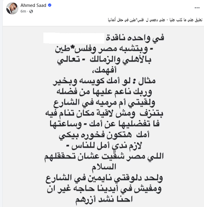 وقال أحمد سعد معلقًا على هجوم الناقدة ماجدة خير الله في رسالة وجهها لها: "تعليق علي ما كتب عليا، علي دعمي لفلسطين في حفل ألمانيا.. في واحده ناقدة... وبتشبه مصر وفلسطين بالأهلي والزمالك"