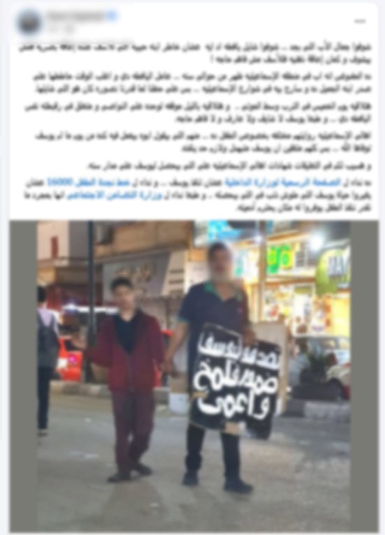كشفت أجهزة الأمن بوزارة الداخلية ملابسات منشور تم تداوله على مواقع التواصل الاجتماعي، مدعوم بصورة، تضمن قيام أحد الأشخاص باستغلال ابنه من ذوي الهمم في استجداء المارة بالشوارع بمحافظة الإسماعيلية.