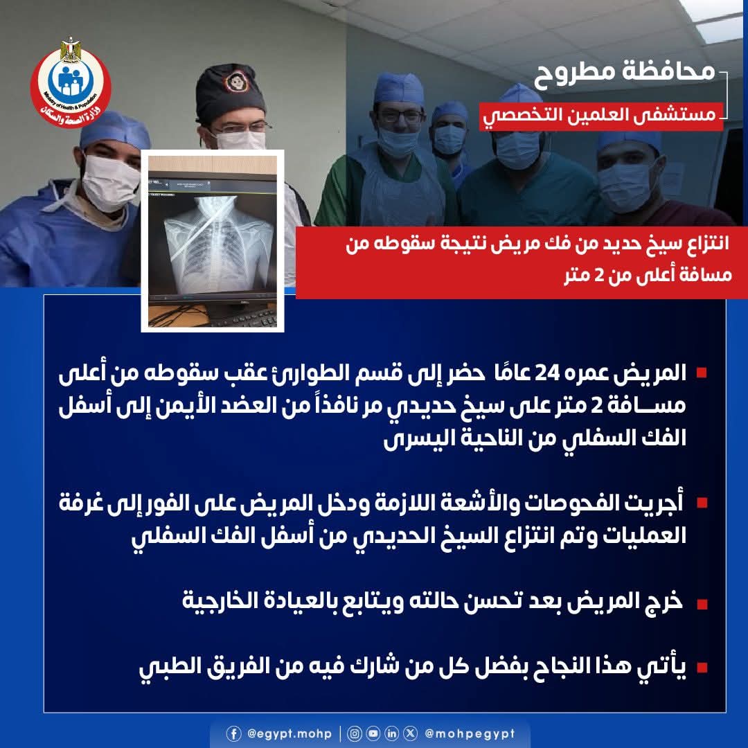 أعلنت وزارة الصحة والسكان عن نجاح الفريق الطبي بمستشفى العلمين التخصصي بمحافظة مطروح في إنقاذ حياة شاب يبلغ من العمر 24 عامًا، بعد تعرضه لإصابة خطيرة إثر سقوطه من ارتفاع يزيد على مترين، ما أدى إلى اختراق سيخ حديدي جسده من العضد الأيمن حتى أسفل الفك السفلي من الناحية اليسرى.