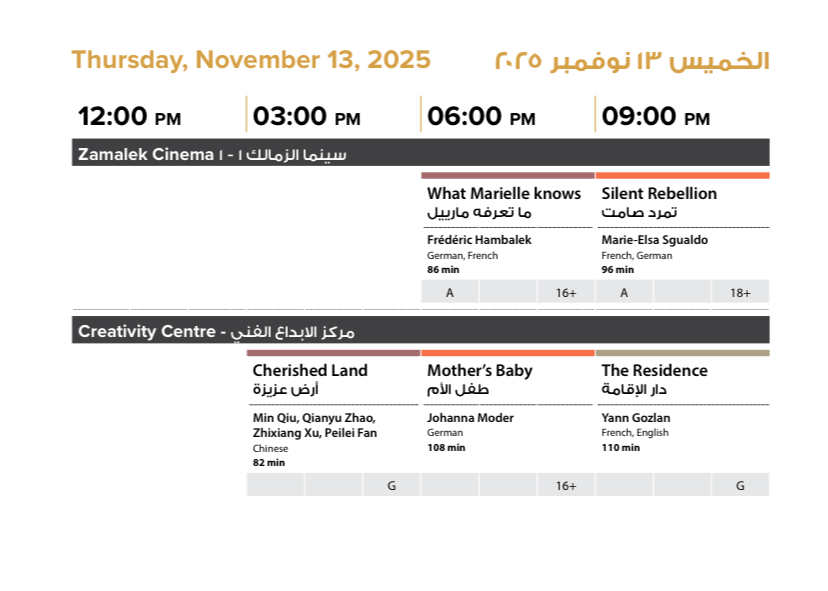 يقيم مهرجان القاهرة السينمائي الدولي اليوم الخميس 13 نوفمبر الجاري، العديد من الفعاليات والندوات وعروض الأفلام ضمن برنامج الدورة السادسة والأربعين من عمر المهرجان والتي افتتحت مساء أمس الأربعاء على المسرح الكبير بدار الأوبرا المصرية.
