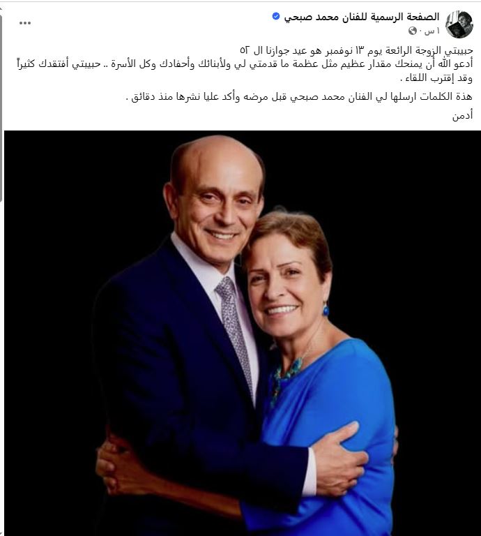 وقال “صبحي” على صفحته بـ"فيس بوك":" حبيبتي الزوجة الرائعة يوم ١٣ نوفمبر هو عيد جوازنا الـ ٥٢ أدعو الله أن يمنحك مقدارًا عظيمًا مثل عظمة ما قدمتِ لي ولأبنائك وأحفادك وكل الأسرة.. حبيبتي أفتقدكِ كثيرًا وقد اقترب اللقاء".