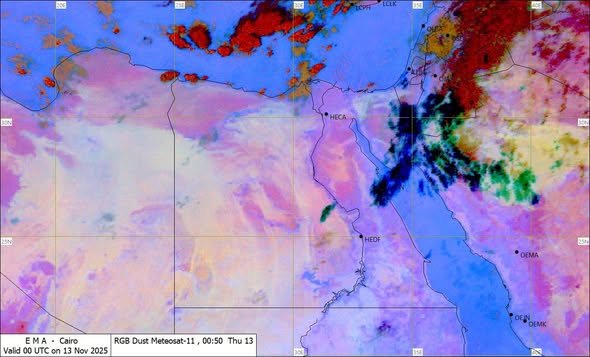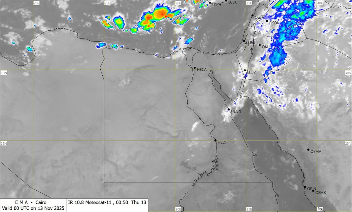 وتظهر بعض السحب المنخفضة على مناطق من شمال البلاد وحتى القاهرة الكبرى ومدن القناة ووسط سيناء ينتج عنها رذاذ خفيف وغير مؤثر.