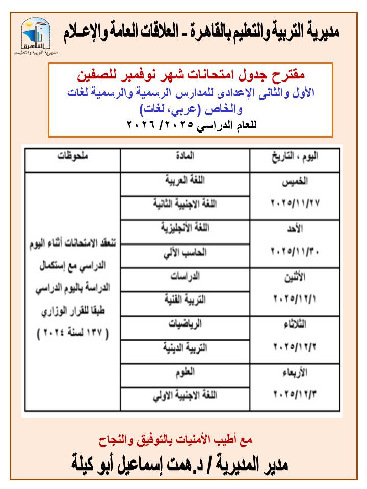 أعلنت مديرية التربية والتعليم بالقاهرة برعاية الدكتورة همت إسماعيل أبو كيلة، عن مقترح جداول امتحانات شهر نوفمبر لمراحل النقل الثلاثة (ابتدائي ـ إعدادى ـ ثانوى) للعام الدراسي ٢٠٢٦/٢٠٢٥.