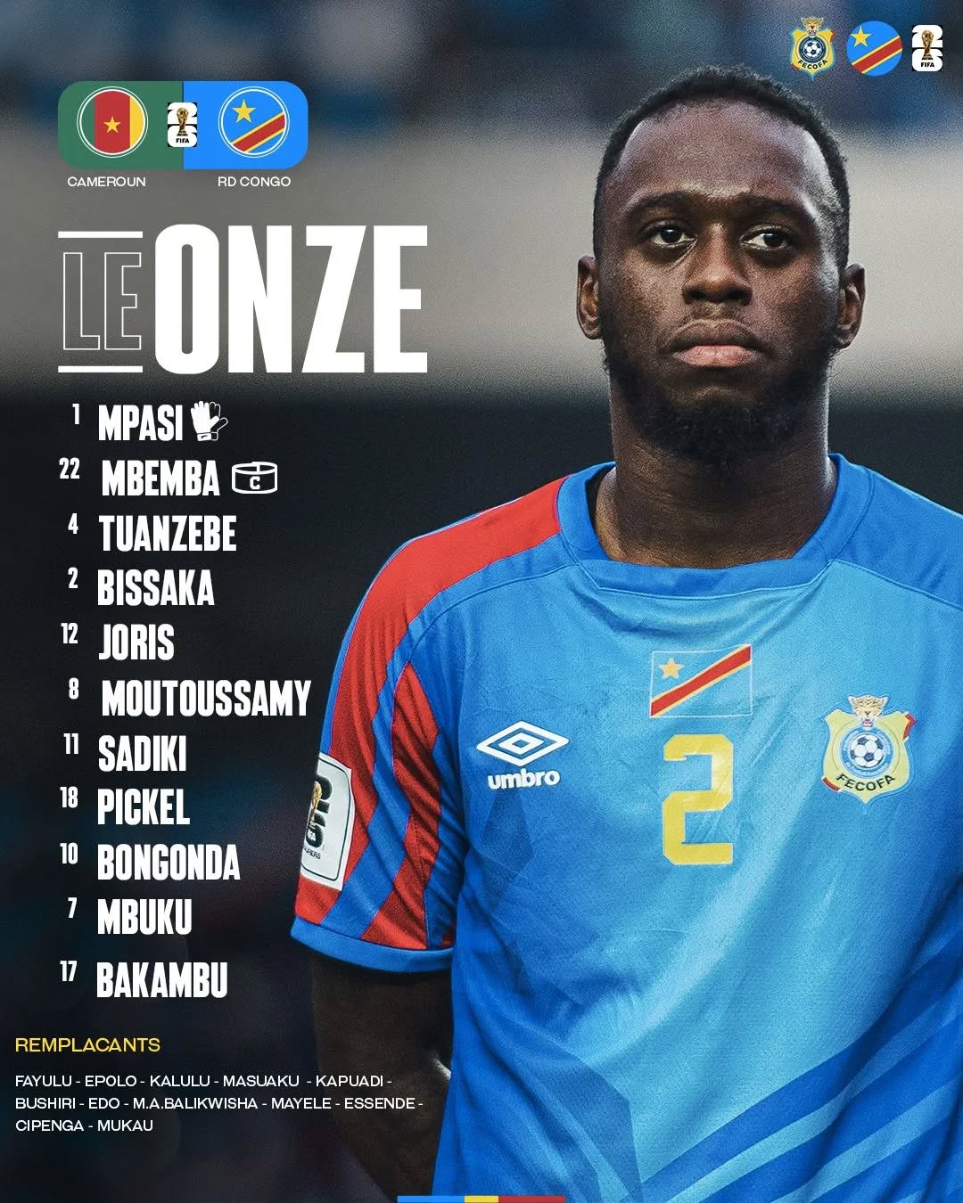 سجل شانسيل مبيمبا هدف منتخب الكونغو الديمقراطية القاتل في مرمى الكاميرون في الدقيقة 90+2، ليضرب موعدا مع نيجيريا في نهائي ملحق المونديال.
