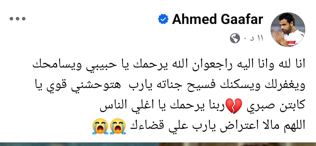 نعى أحمد جعفر لاعب نادي الزمالك السابق، زميله، محمد صبري لاعب الفريق السابق، والذي وافته المنية إثر حادث أليم.
