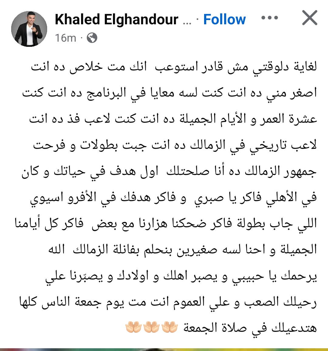 وقال الغندور عبر حسابه لغاية دلوقتي مش قادر استوعب انك مت خلاص ده أنت أصغر مني ده أنت كنت لسه معايا في البرنامج ده أنت كنت عشرة العمر والأيام الجميلة ده أنت كنت لاعب فذ ده أنت لاعب تاريخي في الزمالك ده أنت جبت بطولات وفرحت جمهور الزمالك ده أنا صلحتلك أول هدف في حياتك وكان في الأهلي فاكر يا صبري وفاكر هدفك في الأفرو آسيوي اللي جاب بطولة فاكر ضحكنا هزارنا مع بعض فاكر كل أيامنا الجميلة واحنا لسه صغيرين بنحلم بفانلة الزمالك الله يرحمك يا حبيبي ويصبر أهلك وأولادك ويصبّرنا على رحيلك الصعب وعلي العموم أنت مت يوم جمعة الناس كلها هتدعيلك في صلاة الجمعة.