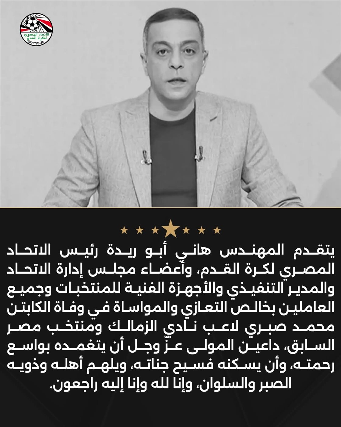 وتقدم الجهاز الفني لمنتخب مصر لكرة القدم بالتعازي لأسرة محمد صبري ولأسرة كرة القدم في وفاة أحد نجومها الكبار.