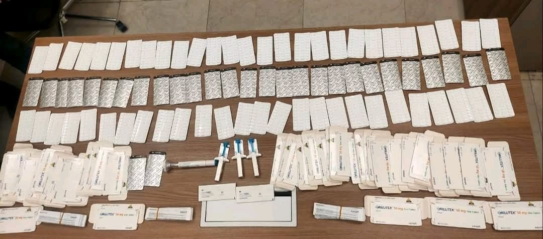 وبتفتيش أمتعة الراكبة لم يتم العثور علي شئ وبتفتيش الراكبة ذاتيا تم العثور علي عدد ۸۲ شریط دواء بشري مدون عليه RILUTEK 50mg وواحد قلم معبًا للحقن مدون عليه Emgality 120mg و٣سرنجة معبأة للحقن مدون عليها SKYRIZI M150G، بخلاف العبوات الفارغة التي ضبطت في وسادة الرقبة الخاصة بالراكبة.