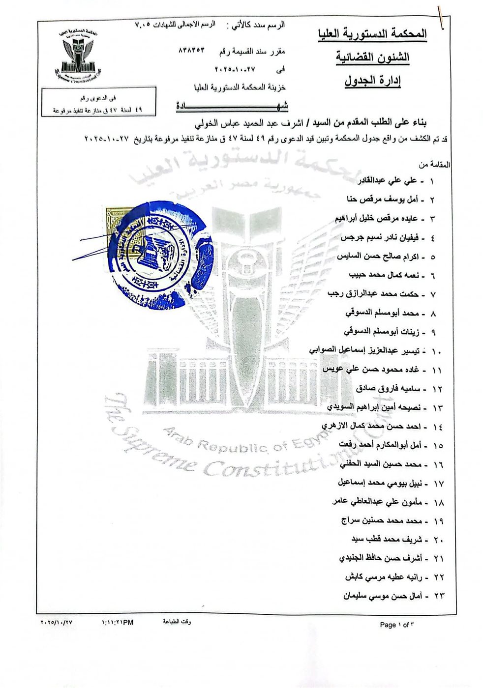 ثالثا:- إعمال المحكمة الدستورية سلطتها طبقا لنص المادة ٢٧ من قانون المحكمة الدستورية العليا رقم ٤٨ لسنة ۱۹۷۹ والتصدي بالحكم بعدم الاعتداد بالقانون رقم ١٦٤ لسنة ۲۰۲٥ في مجمله لمخالفة القواعد المتعلقة بصحة إصداره ووجوب عرضه على مجلس الشيوخ قبل إصدارة بالمخالفة لنص المادة ٢٤٩ من الدستور وما يترتب على ذلك من آثار.