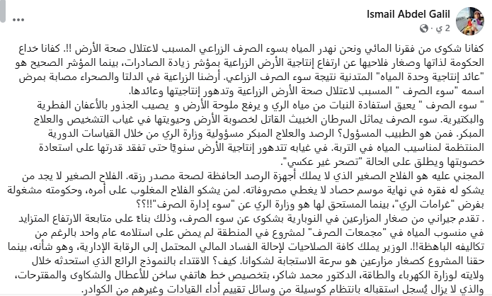 وأشار إلى أن وزارة الري اشترطت أن يتكفل المزارعون بتكلفة إنشاء مجمع الصرف في المنطقة وأن يسددوا التكلفة على أقساط، وأن المزارعين لم يهنأوا طويلًا بالتحسن الملحوظ في صحة التربة ومزروعاتها وإنتاجيتها بعد تنفيذ المجمع، حيث باغتهم انسداد أحد مكونات شبكة الصرف، متسائلا: كيف يسدد المنتفعون أقساطا لمشروع غير مؤهل للانتفاع به؟!.