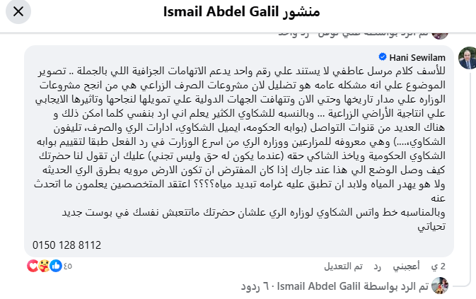 وأكد الوزير أنه يرد بنفسه على كثير من الشكاوى كلما أمكن ذلك، وهناك العديد من قنوات التواصل الحكومية الرسمية المخصصة لذلك وهي معروفة للمزارعين، وأن وزارة الري من أسرع الوزارت في رد الفعل طبقا لتقييم بوابة الشكاوي الحكومية، وأن الشاكي يأخذ حقه عندما يكون له حق وليس تجنيا.