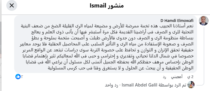 فيما جاءت تعليقات المتابعين من العلماء والمتخصصين في الزراعة والري على المنشور متباينة، حيث علق الدكتور حمدي موافي أستاذ بحوث الأرز بمحطة البحوث الزراعية بسخا، بأن سوء الصرف الزراعي خاصة في شمال الدلتا أصبح يمثل تخمة ممرضة للأرض ومضيعة لمياه الري القليلة الضخ بسبب ضعف البنية التحتية للرى والصرف فى أراضينا القديمة.