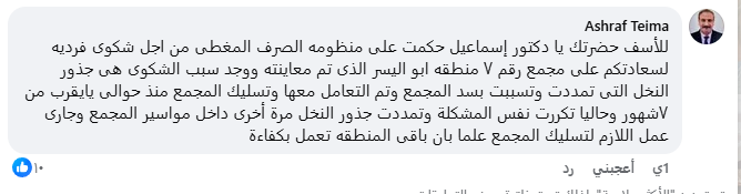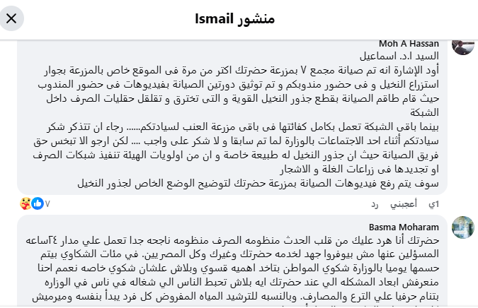فيما توالت عدد من التعليقات من العاملين بوزارة الري تؤكد على جودة منظومة الصرف الزراعي وكفاءتها، مؤكدة أن الشكوى فردية، وأنه تمت معالجتها أكثر من مرة، وأن سبب حدوثها يرجع لأسباب طبيعية، منها تمدد جذور النخيل في المصارف.