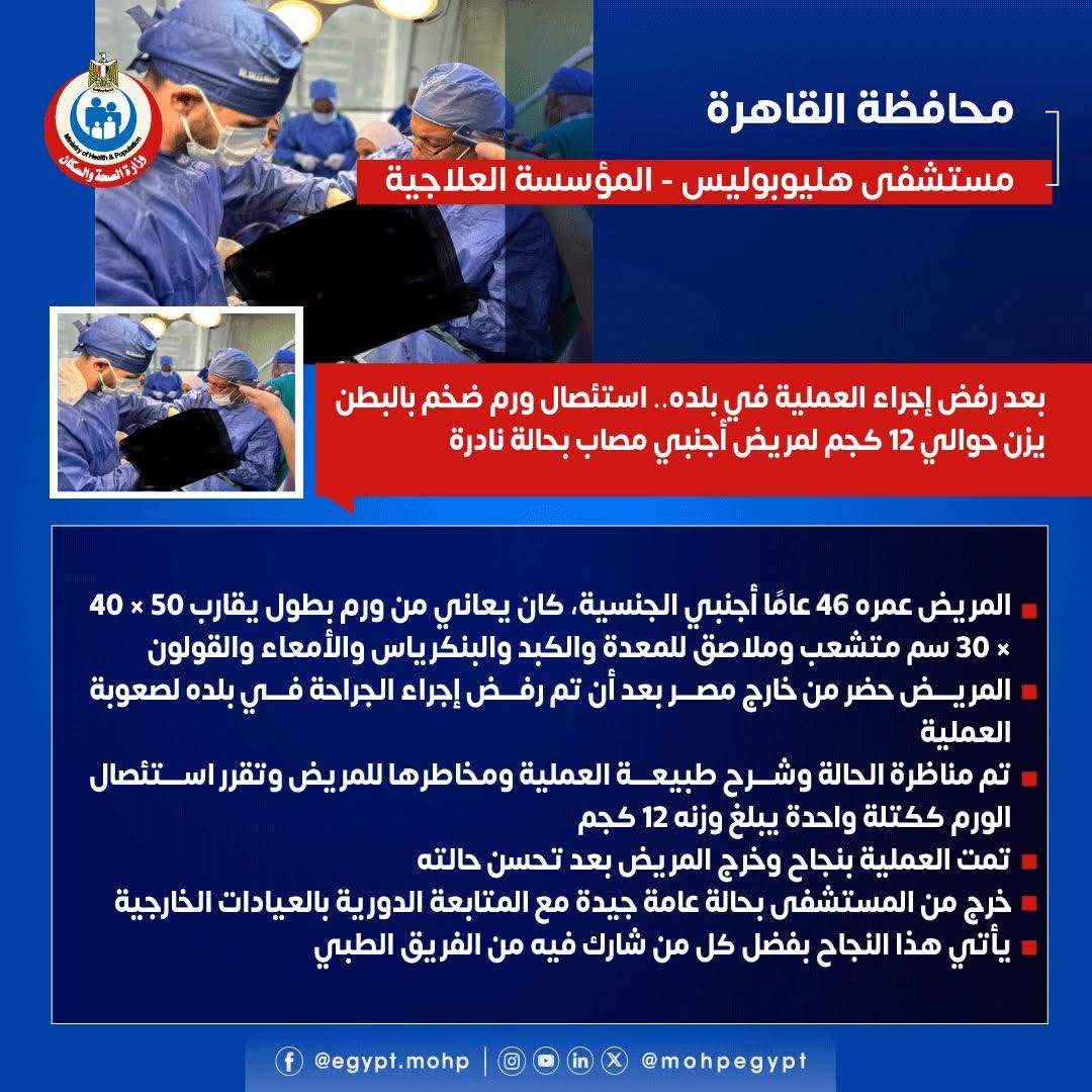 أعلن مستشفى هليوبوليس التابع للمؤسسة العلاجية بوزارة الصحة والسكان بالقاهرة، نجاح فريقها الطبي في إجراء جراحة دقيقة لاستئصال ورم ضخم من بطن مريض أجنبي يبلغ من العمر 46 عامًا، بعدما تم رفض إجراء العملية له في بلده لصعوبتها وخطورتها.