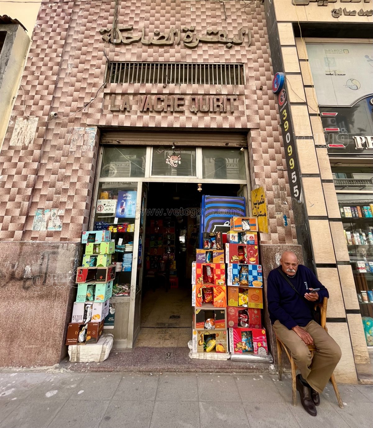 بخط أوروبي مُتقن، لا تزال يافطة “Bel Egypt – La Vache Qui Rit” تتصدر واجهة محل صغير بشارع فؤاد، رغم مرور أكثر من تسعين عامًا على تعليقها. في زمن سابق، كان هذا المكان وكالة رسمية لمنتجات جبنة “لافاش كيري” المستوردة، قبل أن تتغير الحياة ويتغير معها النشاط.
