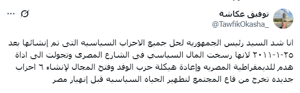 وقال توفيق عكاشة، عبر حسابه بمنصة "أكس"، في رسالته التي وجهها للرئيس السيسي: " أناشد السيد رئيس الجمهورية لحل جميع الاحزاب السياسية التى تم إنشاؤها بعد ٢٥-١-٢٠١١، لأنها رسخت المال السياسي فى الشارع المصرى وتحولت الى أداة هدم للديمقراطية المصرية".