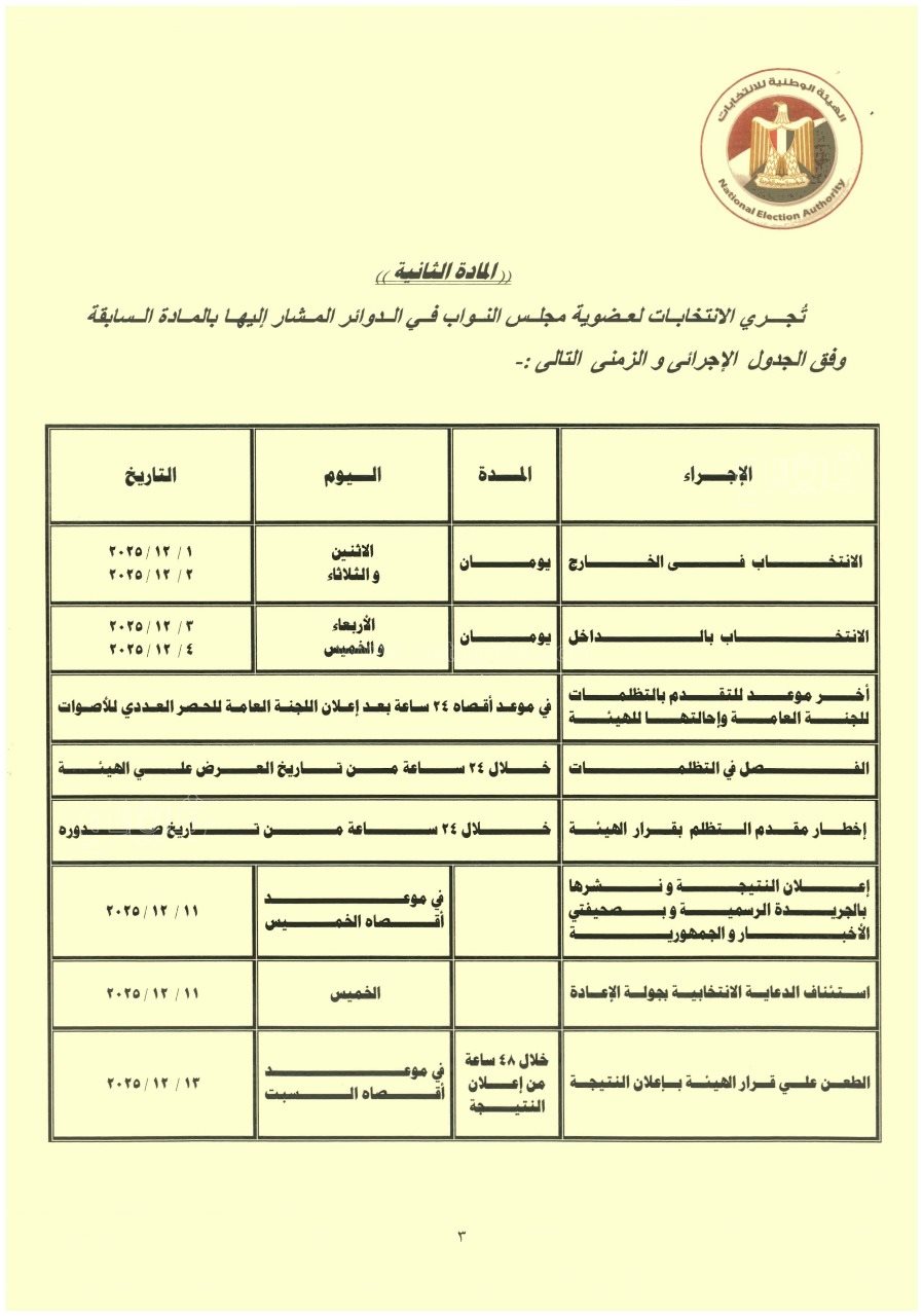 ووفقا للجدول الزمني ستجري الانتخابات في هذه الدوائر للمصريين بالخارج يومي السبت والأحد الموافقين 1 و2 ديسمبر، بينما تستقبل اللجان الانتخابية داخل مصر الناخبين يومي الاثنين والثلاثاء الموافقين 3 و4 ديسمبر.
