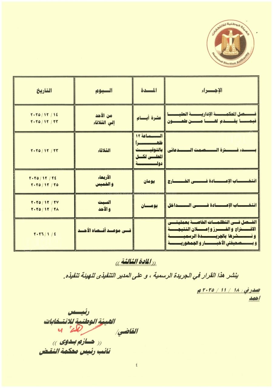 ووفقًا للجدول الزمني الجديد الذي حددته الهيئة، سيتوجه المصريون المقيمون بالخارج إلى صناديق الاقتراع للإدلاء بأصواتهم في جولة الإعادة يومي السبت والأحد الموافقين 24 و25 ديسمبر.